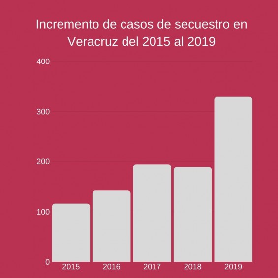 Cifras del Secretariado Ejecutivo Nacional del Sistema Nacional de Seguridad Pública (SENSNSP) indican que en los últimos cinco años, en Veracruz, se ha incrementado el secuestro de forma considerable, al pasar de tener 116 secuestros en 2015 a tener 329 en 2019.