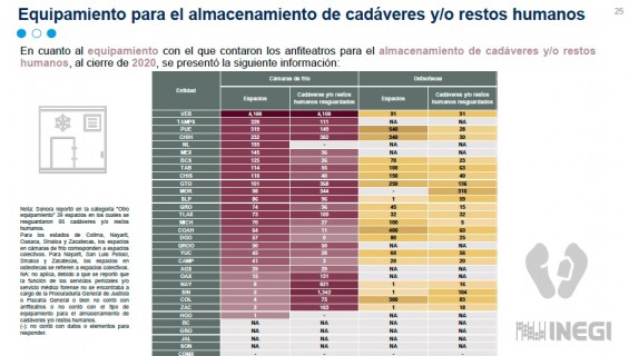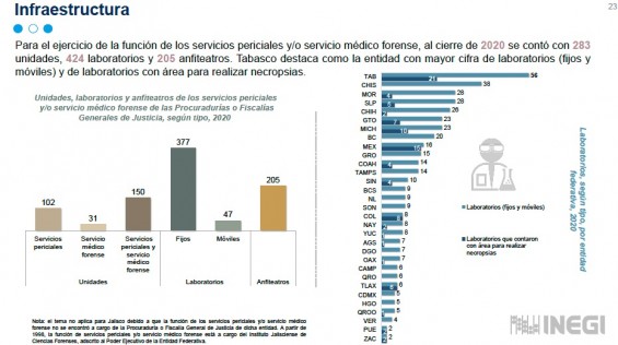 En tanto, Veracruz fue la entidad que presentó la mayor cantidad de unidades de servicios periciales y/o servicio médico forense con 34 y nueve anfiteatros.