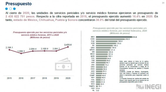 El censo revela que Veracruz ocupa el lugar 13 en presupuesto dedicado para servicios forenses y tiene un rezago en infraestructura. Para 2020, Veracruz dijo contar con cuatro laboratorios con área para realizar necropsias, en comparativa con otras entidades como Tabasco o Chiapas cuentan con hasta 56 y 38 laboratorios.