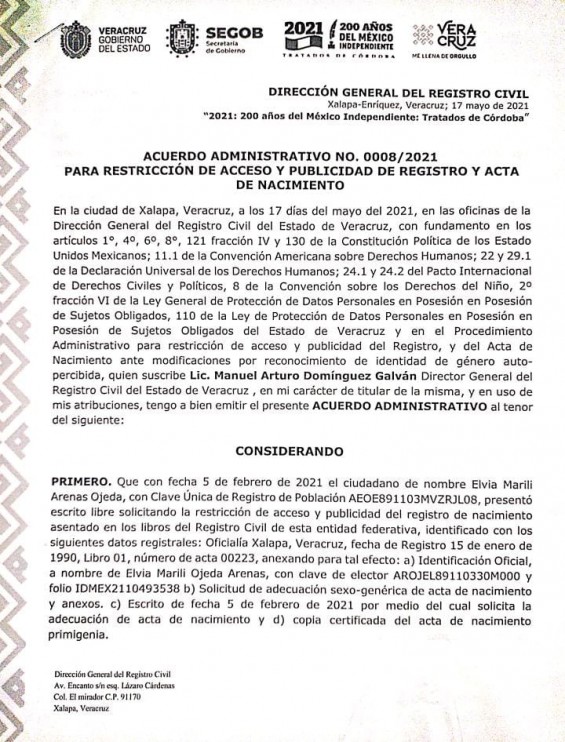 A través de un acuerdo entre grupos defensores de derechos humanos, Comisión Estatal de Derechos Humanos y el Registro Civil de Veracruz, se han impulsado los cambios en actas de nacimiento vía administrativa, lo que ha permitido a más de 200 veracruzanos validar la identidad con la que se identifiquen.