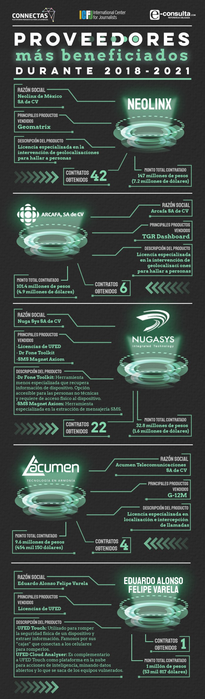 Los gobiernos adquirieron, principalmente, el sistema Geomatrix con la empresa Neolinx de México SA de CV, especializado en intervenir geolocalizaciones, con una inversión nacional superior a los 147 millones de pesos (7.3 millones de dólares). También compraron diversas licencias de UFED, un programa que sirve para extraer datos de dispositivos móviles y localizar información de ciudadanos en Internet, con un pago total de 34.2 millones de pesos (1.7 millones de dólares).
