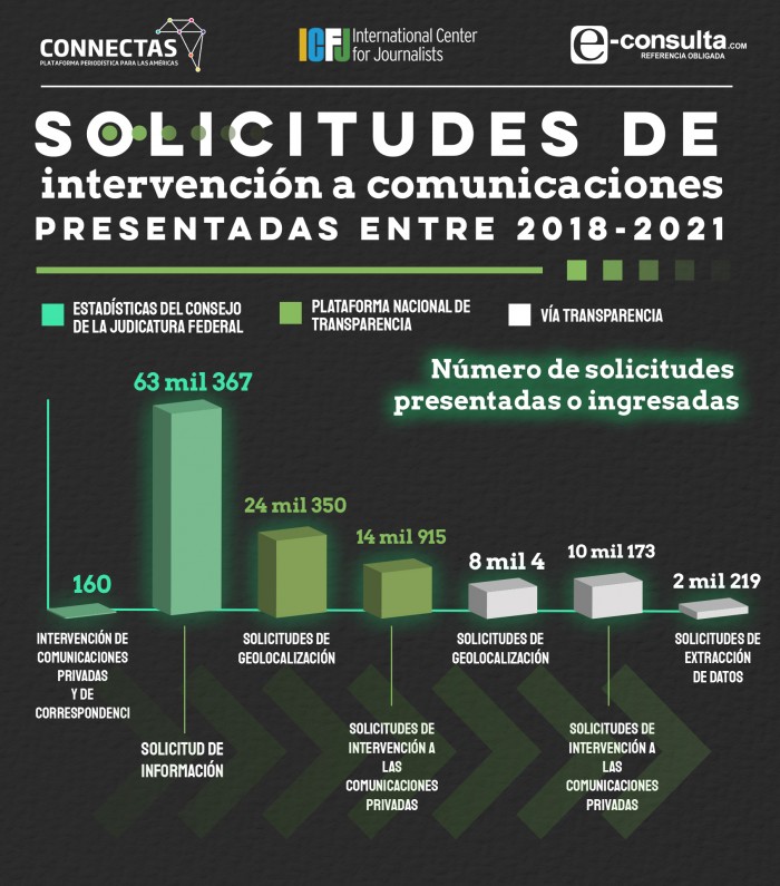 Todas las peticiones de intervención a comunicaciones privadas que posee el Poder Judicial de la Federación se limitan a un número global de 63 mil 527 tramitadas a nivel nacional, entre 2018 y 2021, publicado en su sección de estadística judicial. Aunque, hay otros dos registros que, en ningún caso, coinciden: las fiscalías del país reportan 39 mil 268 peticiones formales de vigilancia en los informes trimestrales que están obligados a presentar sobre las solicitudes que hacen al Poder Judicial; mientras que un tercer registro obtenido vía transparencia indicó que se pidieron 20 mil 396 autorizaciones.