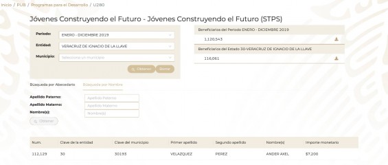 De acuerdo con la información obtenida vía transparencia, el joven beneficiario del programa está inscrito en un régimen fiscal en el que reporta no obtener ganancias derivadas de sueldos, actividades comerciales u otras. Se inscribió ante el Servicio de Administración Tributaria (SAT) bajo el régimen sin obligaciones fiscales.